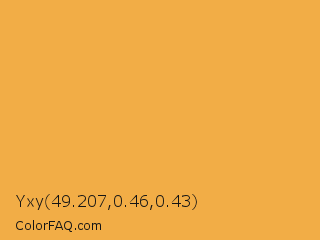 Yxy 49.207,0.46,0.43 Color is a light orange color and the nearest color is Maximum Yellow Red #f2ba49. Hex code #f2ad46 and RGB value is rgb(242,173,70). In RGB color space, this color is composed of 95% red, 68% green, 27% blue, In CMYK color space, this color is composed of 0% cyan, 29% magenta, 71% yellow , 5% black , In HSL color space, this color has a hue angle of 36° , 87% saturation and 61% lightness.