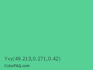 Yxy 49.213,0.271,0.42 Color is a normal green color and the nearest color is Ocean Green #48bf91. Hex code #56d095 and RGB value is rgb(86,208,149). In RGB color space, this color is composed of 34% red, 82% green, 58% blue, In CMYK color space, this color is composed of 59% cyan, 0% magenta, 28% yellow , 18% black , In HSL color space, this color has a hue angle of 151° , 56% saturation and 58% lightness.