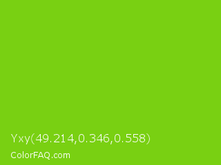 Yxy 49.214,0.346,0.558 Color is a normal green color and the nearest color is Lima #76bd17. Hex code #79d012 and RGB value is rgb(121,208,18). In RGB color space, this color is composed of 47% red, 82% green, 7% blue, In CMYK color space, this color is composed of 42% cyan, 0% magenta, 91% yellow , 18% black , In HSL color space, this color has a hue angle of 87° , 84% saturation and 44% lightness.