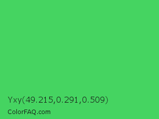 Yxy 49.215,0.291,0.509 Color is a normal green color and the nearest color is UFO Green #3cd070. Hex code #45d461 and RGB value is rgb(69,212,97). In RGB color space, this color is composed of 27% red, 83% green, 38% blue, In CMYK color space, this color is composed of 67% cyan, 0% magenta, 54% yellow , 17% black , In HSL color space, this color has a hue angle of 132° , 62% saturation and 55% lightness.
