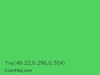 Yxy 49.22,0.296,0.504 Color is a normal green color and the nearest color is Emerald #50c878. Hex code #51d362 and RGB value is rgb(81,211,98). In RGB color space, this color is composed of 32% red, 83% green, 38% blue, In CMYK color space, this color is composed of 62% cyan, 0% magenta, 54% yellow , 17% black , In HSL color space, this color has a hue angle of 128° , 60% saturation and 57% lightness.