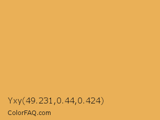 Yxy 49.231,0.44,0.424 Color is a light orange color and the nearest color is Sunray #e3ab57. Hex code #eab057 and RGB value is rgb(234,176,87). In RGB color space, this color is composed of 92% red, 69% green, 34% blue, In CMYK color space, this color is composed of 0% cyan, 25% magenta, 63% yellow , 8% black , In HSL color space, this color has a hue angle of 36° , 78% saturation and 63% lightness.
