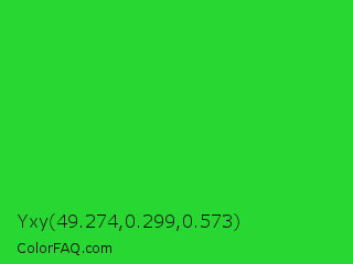Yxy 49.274,0.299,0.573 Color is a normal green color and the nearest color is Lime Green #32cd32. Hex code #28d731 and RGB value is rgb(40,215,49). In RGB color space, this color is composed of 16% red, 84% green, 19% blue, In CMYK color space, this color is composed of 81% cyan, 0% magenta, 77% yellow , 16% black , In HSL color space, this color has a hue angle of 123° , 69% saturation and 50% lightness.