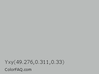 Yxy 49.276,0.311,0.33 Color is a light green color and the nearest color is Gray X11 Gray #bebebe. Hex code #b8bbba and RGB value is rgb(184,187,186). In RGB color space, this color is composed of 72% red, 73% green, 73% blue, In CMYK color space, this color is composed of 2% cyan, 0% magenta, 1% yellow , 27% black , In HSL color space, this color has a hue angle of 160° , 2% saturation and 73% lightness.