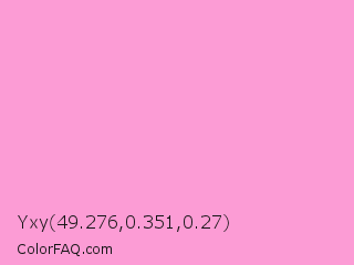 Yxy 49.276,0.351,0.27 Color is a light magenta color and the nearest color is Pale Magenta Pink #ff99cc. Hex code #fc9cd5 and RGB value is rgb(252,156,213). In RGB color space, this color is composed of 99% red, 61% green, 84% blue, In CMYK color space, this color is composed of 0% cyan, 38% magenta, 15% yellow , 1% black , In HSL color space, this color has a hue angle of 324° , 94% saturation and 80% lightness.