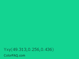 Yxy 49.313,0.256,0.436 Color is a normal green color and the nearest color is Caribbean Green #00cc99. Hex code #13d491 and RGB value is rgb(19,212,145). In RGB color space, this color is composed of 7% red, 83% green, 57% blue, In CMYK color space, this color is composed of 91% cyan, 0% magenta, 32% yellow , 17% black , In HSL color space, this color has a hue angle of 159° , 84% saturation and 45% lightness.