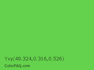 Yxy 49.324,0.316,0.526 Color is a normal green color and the nearest color is Mantis #74c365. Hex code #64d24c and RGB value is rgb(100,210,76). In RGB color space, this color is composed of 39% red, 82% green, 30% blue, In CMYK color space, this color is composed of 52% cyan, 0% magenta, 64% yellow , 18% black , In HSL color space, this color has a hue angle of 109° , 60% saturation and 56% lightness.