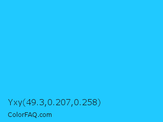Yxy 49.3,0.207,0.258 Color is a normal blue color and the nearest color is Spiro Disco Ball #0fc0fc. Hex code #20c9ff and RGB value is rgb(32,201,255). In RGB color space, this color is composed of 13% red, 79% green, 100% blue, In CMYK color space, this color is composed of 87% cyan, 21% magenta, 0% yellow , 0% black , In HSL color space, this color has a hue angle of 195° , 100% saturation and 56% lightness.