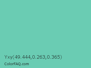 Yxy 49.444,0.263,0.365 Color is a light cyan color and the nearest color is Downy #6fd0c5. Hex code #6accb3 and RGB value is rgb(106,204,179). In RGB color space, this color is composed of 42% red, 80% green, 70% blue, In CMYK color space, this color is composed of 48% cyan, 0% magenta, 12% yellow , 20% black , In HSL color space, this color has a hue angle of 165° , 49% saturation and 61% lightness.