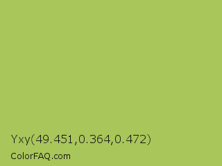 Yxy 49.451,0.364,0.472 Color is a normal lime color and the nearest color is Middle Green Yellow #acbf60. Hex code #a8c65a and RGB value is rgb(168,198,90). In RGB color space, this color is composed of 66% red, 78% green, 35% blue, In CMYK color space, this color is composed of 15% cyan, 0% magenta, 55% yellow , 22% black , In HSL color space, this color has a hue angle of 77° , 49% saturation and 56% lightness.