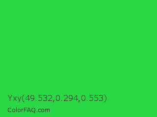 Yxy 49.532,0.294,0.553 Color is a normal green color and the nearest color is Lime Green #32cd32. Hex code #2ad744 and RGB value is rgb(42,215,68). In RGB color space, this color is composed of 16% red, 84% green, 27% blue, In CMYK color space, this color is composed of 80% cyan, 0% magenta, 68% yellow , 16% black , In HSL color space, this color has a hue angle of 129° , 68% saturation and 50% lightness.
