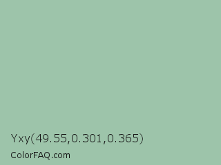 Yxy 49.55,0.301,0.365 Color is a light green color and the nearest color is Cambridge Blue #a3c1ad. Hex code #9dc4aa and RGB value is rgb(157,196,170). In RGB color space, this color is composed of 62% red, 77% green, 67% blue, In CMYK color space, this color is composed of 20% cyan, 0% magenta, 13% yellow , 23% black , In HSL color space, this color has a hue angle of 140° , 25% saturation and 69% lightness.