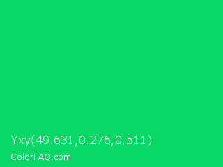 Yxy 49.631,0.276,0.511 Color is a normal green color and the nearest color is Malachite #0bda51. Hex code #09d766 and RGB value is rgb(9,215,102). In RGB color space, this color is composed of 4% red, 84% green, 40% blue, In CMYK color space, this color is composed of 96% cyan, 0% magenta, 53% yellow , 16% black , In HSL color space, this color has a hue angle of 147° , 92% saturation and 44% lightness.