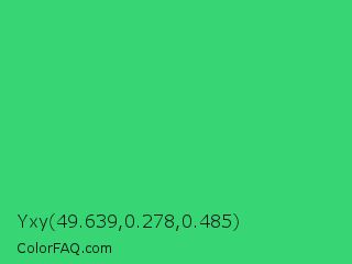 Yxy 49.639,0.278,0.485 Color is a normal green color and the nearest color is UFO Green #3cd070. Hex code #37d573 and RGB value is rgb(55,213,115). In RGB color space, this color is composed of 22% red, 84% green, 45% blue, In CMYK color space, this color is composed of 74% cyan, 0% magenta, 46% yellow , 16% black , In HSL color space, this color has a hue angle of 143° , 65% saturation and 53% lightness.