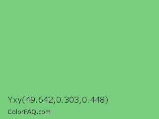 Yxy 49.642,0.303,0.448 Color is a light green color and the nearest color is De York #7ac488. Hex code #78ce7e and RGB value is rgb(120,206,126). In RGB color space, this color is composed of 47% red, 81% green, 49% blue, In CMYK color space, this color is composed of 42% cyan, 0% magenta, 39% yellow , 19% black , In HSL color space, this color has a hue angle of 124° , 47% saturation and 64% lightness.