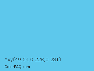 Yxy 49.64,0.228,0.281 Color is a light blue color and the nearest color is Viking #64ccdb. Hex code #5dc8ec and RGB value is rgb(93,200,236). In RGB color space, this color is composed of 36% red, 78% green, 93% blue, In CMYK color space, this color is composed of 61% cyan, 15% magenta, 0% yellow , 7% black , In HSL color space, this color has a hue angle of 195° , 79% saturation and 65% lightness.