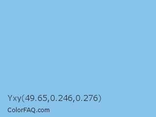 Yxy 49.65,0.246,0.276 Color is a light blue color and the nearest color is Jordy Blue #8ab9f1. Hex code #87c2eb and RGB value is rgb(135,194,235). In RGB color space, this color is composed of 53% red, 76% green, 92% blue, In CMYK color space, this color is composed of 43% cyan, 17% magenta, 0% yellow , 8% black , In HSL color space, this color has a hue angle of 205° , 71% saturation and 73% lightness.