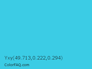 Yxy 49.713,0.222,0.294 Color is a normal cyan color and the nearest color is Scooter #2ebfd4. Hex code #3bcce5 and RGB value is rgb(59,204,229). In RGB color space, this color is composed of 23% red, 80% green, 90% blue, In CMYK color space, this color is composed of 74% cyan, 11% magenta, 0% yellow , 10% black , In HSL color space, this color has a hue angle of 189° , 77% saturation and 56% lightness.