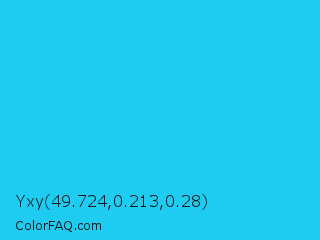 Yxy 49.724,0.213,0.28 Color is a normal cyan color and the nearest color is Spiro Disco Ball #0fc0fc. Hex code #1dccf0 and RGB value is rgb(29,204,240). In RGB color space, this color is composed of 11% red, 80% green, 94% blue, In CMYK color space, this color is composed of 88% cyan, 15% magenta, 0% yellow , 6% black , In HSL color space, this color has a hue angle of 190° , 88% saturation and 53% lightness.