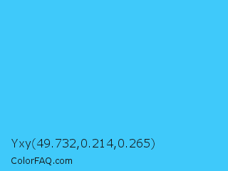 Yxy 49.732,0.214,0.265 Color is a light blue color and the nearest color is Picton Blue #45b1e8. Hex code #3fc9fa and RGB value is rgb(63,201,250). In RGB color space, this color is composed of 25% red, 79% green, 98% blue, In CMYK color space, this color is composed of 75% cyan, 20% magenta, 0% yellow , 2% black , In HSL color space, this color has a hue angle of 196° , 95% saturation and 61% lightness.