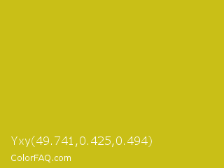 Yxy 49.741,0.425,0.494 Color is a normal yellow color and the nearest color is Key Lime Pie #bfc921. Hex code #c9bf17 and RGB value is rgb(201,191,23). In RGB color space, this color is composed of 79% red, 75% green, 9% blue, In CMYK color space, this color is composed of 0% cyan, 5% magenta, 89% yellow , 21% black , In HSL color space, this color has a hue angle of 57° , 79% saturation and 44% lightness.