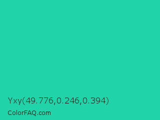 Yxy 49.776,0.246,0.394 Color is a normal cyan color and the nearest color is Shamrock #33cc99. Hex code #21d3a9 and RGB value is rgb(33,211,169). In RGB color space, this color is composed of 13% red, 83% green, 66% blue, In CMYK color space, this color is composed of 84% cyan, 0% magenta, 20% yellow , 17% black , In HSL color space, this color has a hue angle of 166° , 73% saturation and 48% lightness.