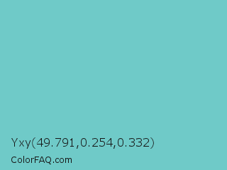 Yxy 49.791,0.254,0.332 Color is a light cyan color and the nearest color is Downy #6fd0c5. Hex code #6fcac8 and RGB value is rgb(111,202,200). In RGB color space, this color is composed of 44% red, 79% green, 78% blue, In CMYK color space, this color is composed of 45% cyan, 0% magenta, 1% yellow , 21% black , In HSL color space, this color has a hue angle of 179° , 46% saturation and 61% lightness.
