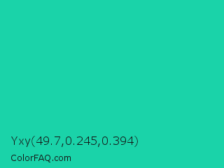 Yxy 49.7,0.245,0.394 Color is a normal cyan color and the nearest color is Shamrock #33cc99. Hex code #1ad3a9 and RGB value is rgb(26,211,169). In RGB color space, this color is composed of 10% red, 83% green, 66% blue, In CMYK color space, this color is composed of 88% cyan, 0% magenta, 20% yellow , 17% black , In HSL color space, this color has a hue angle of 166° , 78% saturation and 46% lightness.