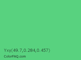 Yxy 49.7,0.284,0.457 Color is a normal green color and the nearest color is Emerald #50c878. Hex code #58d27f and RGB value is rgb(88,210,127). In RGB color space, this color is composed of 35% red, 82% green, 50% blue, In CMYK color space, this color is composed of 58% cyan, 0% magenta, 40% yellow , 18% black , In HSL color space, this color has a hue angle of 139° , 58% saturation and 58% lightness.