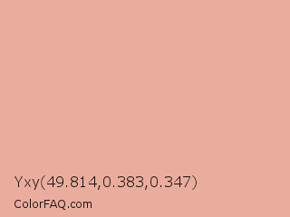 Yxy 49.814,0.383,0.347 Color is a light red color and the nearest color is Pastel Pink #dea5a4. Hex code #eaad9d and RGB value is rgb(234,173,157). In RGB color space, this color is composed of 92% red, 68% green, 62% blue, In CMYK color space, this color is composed of 0% cyan, 26% magenta, 33% yellow , 8% black , In HSL color space, this color has a hue angle of 12° , 65% saturation and 77% lightness.