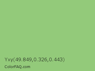 Yxy 49.849,0.326,0.443 Color is a light green color and the nearest color is Pistachio #93c572. Hex code #93ca7a and RGB value is rgb(147,202,122). In RGB color space, this color is composed of 58% red, 79% green, 48% blue, In CMYK color space, this color is composed of 27% cyan, 0% magenta, 40% yellow , 21% black , In HSL color space, this color has a hue angle of 101° , 43% saturation and 64% lightness.