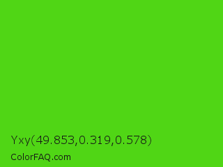 Yxy 49.853,0.319,0.578 Color is a normal green color and the nearest color is Harlequin Green #46cb18. Hex code #50d615 and RGB value is rgb(80,214,21). In RGB color space, this color is composed of 31% red, 84% green, 8% blue, In CMYK color space, this color is composed of 63% cyan, 0% magenta, 90% yellow , 16% black , In HSL color space, this color has a hue angle of 102° , 82% saturation and 46% lightness.
