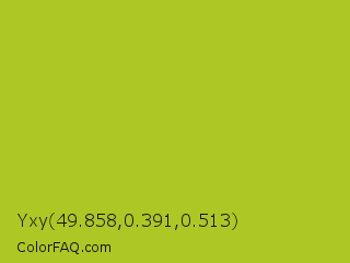 Yxy 49.858,0.391,0.513 Color is a normal yellow color and the nearest color is Acid Green #b0bf1a. Hex code #adc724 and RGB value is rgb(173,199,36). In RGB color space, this color is composed of 68% red, 78% green, 14% blue, In CMYK color space, this color is composed of 13% cyan, 0% magenta, 82% yellow , 22% black , In HSL color space, this color has a hue angle of 70° , 69% saturation and 46% lightness.