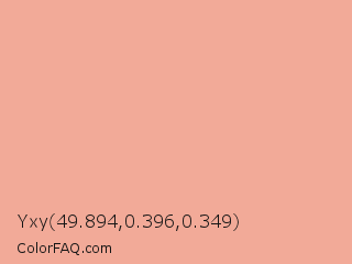 Yxy 49.894,0.396,0.349 Color is a light red color and the nearest color is Mona Lisa #ffa194. Hex code #f2aa98 and RGB value is rgb(242,170,152). In RGB color space, this color is composed of 95% red, 67% green, 60% blue, In CMYK color space, this color is composed of 0% cyan, 30% magenta, 37% yellow , 5% black , In HSL color space, this color has a hue angle of 12° , 78% saturation and 77% lightness.