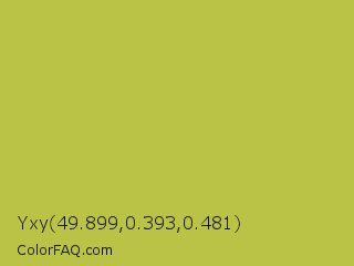 Yxy 49.899,0.393,0.481 Color is a normal yellow color and the nearest color is Turmeric #cabb48. Hex code #bac345 and RGB value is rgb(186,195,69). In RGB color space, this color is composed of 73% red, 76% green, 27% blue, In CMYK color space, this color is composed of 5% cyan, 0% magenta, 65% yellow , 24% black , In HSL color space, this color has a hue angle of 64° , 51% saturation and 52% lightness.