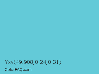 Yxy 49.908,0.24,0.31 Color is a light cyan color and the nearest color is Viking #64ccdb. Hex code #63cad8 and RGB value is rgb(99,202,216). In RGB color space, this color is composed of 39% red, 79% green, 85% blue, In CMYK color space, this color is composed of 54% cyan, 6% magenta, 0% yellow , 15% black , In HSL color space, this color has a hue angle of 187° , 60% saturation and 62% lightness.