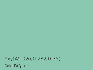 Yxy 49.926,0.282,0.36 Color is a light green color and the nearest color is Vista Blue #8fd6b4. Hex code #8ac8b2 and RGB value is rgb(138,200,178). In RGB color space, this color is composed of 54% red, 78% green, 70% blue, In CMYK color space, this color is composed of 31% cyan, 0% magenta, 11% yellow , 22% black , In HSL color space, this color has a hue angle of 159° , 36% saturation and 66% lightness.