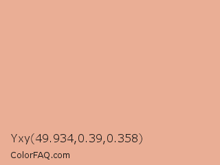 Yxy 49.934,0.39,0.358 Color is a light orange color and the nearest color is Tonys Pink #e79f8c. Hex code #eaae95 and RGB value is rgb(234,174,149). In RGB color space, this color is composed of 92% red, 68% green, 58% blue, In CMYK color space, this color is composed of 0% cyan, 26% magenta, 36% yellow , 8% black , In HSL color space, this color has a hue angle of 18° , 67% saturation and 75% lightness.