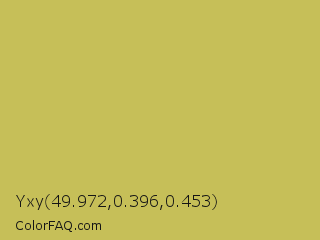 Yxy 49.972,0.396,0.453 Color is a normal yellow color and the nearest color is Vegas Gold #c5b358. Hex code #c6bf58 and RGB value is rgb(198,191,88). In RGB color space, this color is composed of 78% red, 75% green, 35% blue, In CMYK color space, this color is composed of 0% cyan, 4% magenta, 56% yellow , 22% black , In HSL color space, this color has a hue angle of 56° , 49% saturation and 56% lightness.