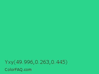 Yxy 49.996,0.263,0.445 Color is a normal green color and the nearest color is Shamrock #33cc99. Hex code #2cd58c and RGB value is rgb(44,213,140). In RGB color space, this color is composed of 17% red, 84% green, 55% blue, In CMYK color space, this color is composed of 79% cyan, 0% magenta, 34% yellow , 16% black , In HSL color space, this color has a hue angle of 154° , 67% saturation and 50% lightness.