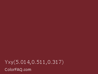 Yxy 5.014,0.511,0.317 Color is a dark red color and the nearest color is Crown Of Thorns #771f1f. Hex code #73232a and RGB value is rgb(115,35,42). In RGB color space, this color is composed of 45% red, 14% green, 16% blue, In CMYK color space, this color is composed of 0% cyan, 70% magenta, 63% yellow , 55% black , In HSL color space, this color has a hue angle of 355° , 53% saturation and 29% lightness.