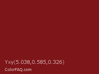 Yxy 5.038,0.585,0.326 Color is a dark red color and the nearest color is Falu Red #801818. Hex code #7e1518 and RGB value is rgb(126,21,24). In RGB color space, this color is composed of 49% red, 8% green, 9% blue, In CMYK color space, this color is composed of 0% cyan, 83% magenta, 81% yellow , 51% black , In HSL color space, this color has a hue angle of 358° , 71% saturation and 29% lightness.