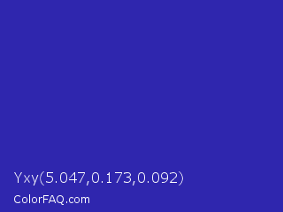 Yxy 5.047,0.173,0.092 Color is a normal indigo color and the nearest color is Governor Bay #2f3cb3. Hex code #2f26ae and RGB value is rgb(47,38,174). In RGB color space, this color is composed of 18% red, 15% green, 68% blue, In CMYK color space, this color is composed of 73% cyan, 78% magenta, 0% yellow , 32% black , In HSL color space, this color has a hue angle of 244° , 64% saturation and 42% lightness.
