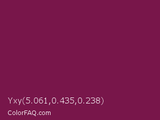 Yxy 5.061,0.435,0.238 Color is a dark rose color and the nearest color is Pansy Purple #78184a. Hex code #78164a and RGB value is rgb(120,22,74). In RGB color space, this color is composed of 47% red, 9% green, 29% blue, In CMYK color space, this color is composed of 0% cyan, 82% magenta, 38% yellow , 53% black , In HSL color space, this color has a hue angle of 328° , 69% saturation and 28% lightness.