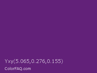 Yxy 5.065,0.276,0.155 Color is a dark purple color and the nearest color is Midnight #702670. Hex code #622179 and RGB value is rgb(98,33,121). In RGB color space, this color is composed of 38% red, 13% green, 47% blue, In CMYK color space, this color is composed of 19% cyan, 73% magenta, 0% yellow , 53% black , In HSL color space, this color has a hue angle of 284° , 57% saturation and 30% lightness.