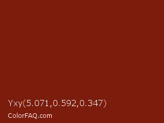 Yxy 5.071,0.592,0.347 Color is a dark red color and the nearest color is Kenyan Copper #7c1c05. Hex code #7b1c0d and RGB value is rgb(123,28,13). In RGB color space, this color is composed of 48% red, 11% green, 5% blue, In CMYK color space, this color is composed of 0% cyan, 77% magenta, 89% yellow , 52% black , In HSL color space, this color has a hue angle of 8° , 81% saturation and 27% lightness.