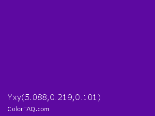 Yxy 5.088,0.219,0.101 Color is a normal purple color and the nearest color is Purple #660099. Hex code #5d09a1 and RGB value is rgb(93,9,161). In RGB color space, this color is composed of 36% red, 4% green, 63% blue, In CMYK color space, this color is composed of 42% cyan, 94% magenta, 0% yellow , 37% black , In HSL color space, this color has a hue angle of 273° , 89% saturation and 33% lightness.