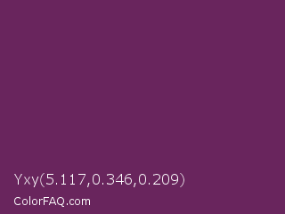 Yxy 5.117,0.346,0.209 Color is a dark magenta color and the nearest color is Palatinate Purple #682860. Hex code #69255d and RGB value is rgb(105,37,93). In RGB color space, this color is composed of 41% red, 15% green, 36% blue, In CMYK color space, this color is composed of 0% cyan, 65% magenta, 11% yellow , 59% black , In HSL color space, this color has a hue angle of 311° , 48% saturation and 28% lightness.