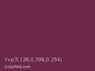 Yxy 5.138,0.398,0.254 Color is a dark rose color and the nearest color is Tawny Port #692545. Hex code #6b284a and RGB value is rgb(107,40,74). In RGB color space, this color is composed of 42% red, 16% green, 29% blue, In CMYK color space, this color is composed of 0% cyan, 63% magenta, 31% yellow , 58% black , In HSL color space, this color has a hue angle of 330° , 46% saturation and 29% lightness.