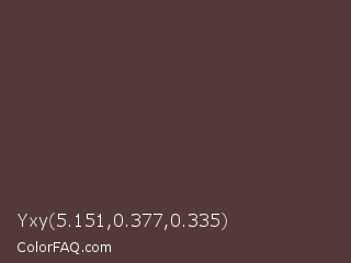 Yxy 5.151,0.377,0.335 Color is a dark red color and the nearest color is Dark Liver Horses #543d37. Hex code #533a38 and RGB value is rgb(83,58,56). In RGB color space, this color is composed of 33% red, 23% green, 22% blue, In CMYK color space, this color is composed of 0% cyan, 30% magenta, 33% yellow , 67% black , In HSL color space, this color has a hue angle of 4° , 19% saturation and 27% lightness.